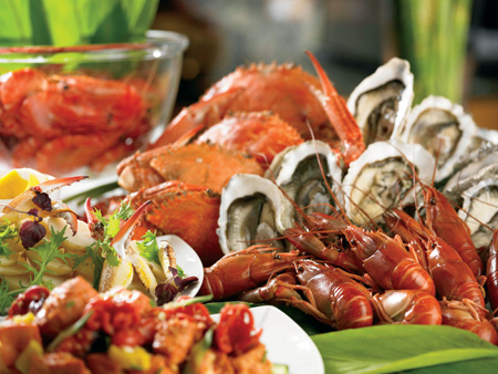 Featured every Friday and Saturday evening, this seafood extravaganza is RMB 328+ for adults and RMB 164+ for children (6 to 12 years). It includes free-flowing soft drinks, fresh juices, house red and white wine, vodka from the caviar station as well as coffee or tea, and a choice of individual servings of either a Boston lobster or a King Sea Crab.